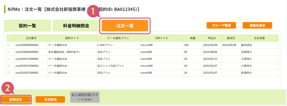 - タブ「注文一覧」を押して表示させます。(上図①)。ページの左下の「新規注文」ボタンを押してSIM新規注文を行うことができます(上図②)。