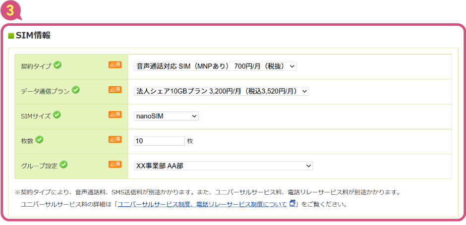 - 契約タイプ・データ通信プラン・SIMサイズ・オプション申込有無が同じであれば、一度の注文で複数枚のSIMをお申し込みいただくことが可能です(上図③)。また、注文ごとに送付先を指定することが可能です。