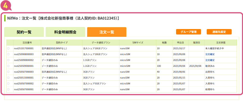 - 注文いただいたSIMの状況は、注文ごとに一覧画面で確認できます。入荷待ち・処理待ち・本人確認手続き中といった進捗がわかり、SIMがお手元に届くまでのステータスを確認いただくことが可能です(上図④)。